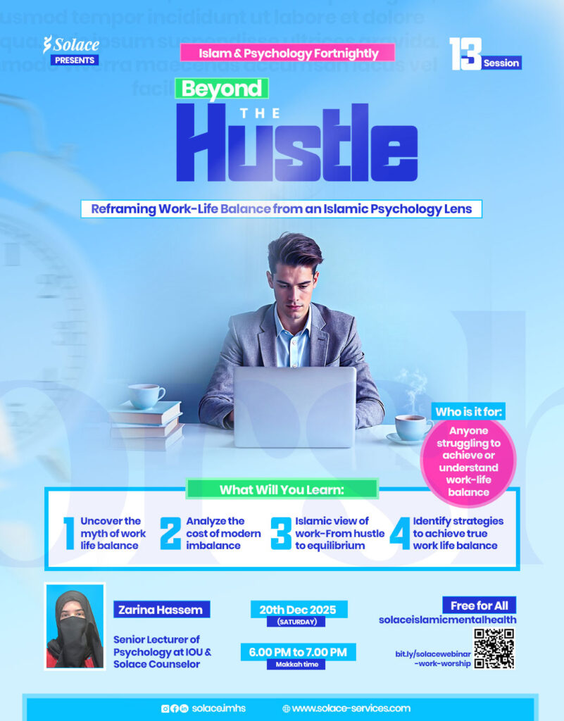 Our upcoming Islam & Psychology Fortnightly webinar with Zarina Hassem on the topic “When Work Becomes Worship ” is especially designed to understand the reasons behind our current work-life imbalance, what is keeping us stuck in a cycle of stress and burnout, & how we can truly strike a balance in a world that is being desiged for hustle!
