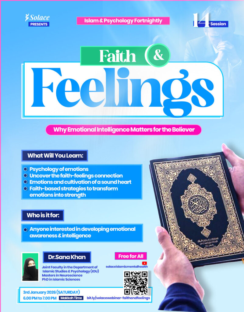 Our upcoming Islam & Psychology Fortnightly webinar with Dr. Sana Khan on the topic ” Faith & Feelings: Why Emotional Intelligence Matters for the Believer” is especially designed to understand the purpose and power of emotions and how we can develop emotional awareness and intelligence thereby facilitating our spiritual health and Qalb-e-Saleem (pure heart).