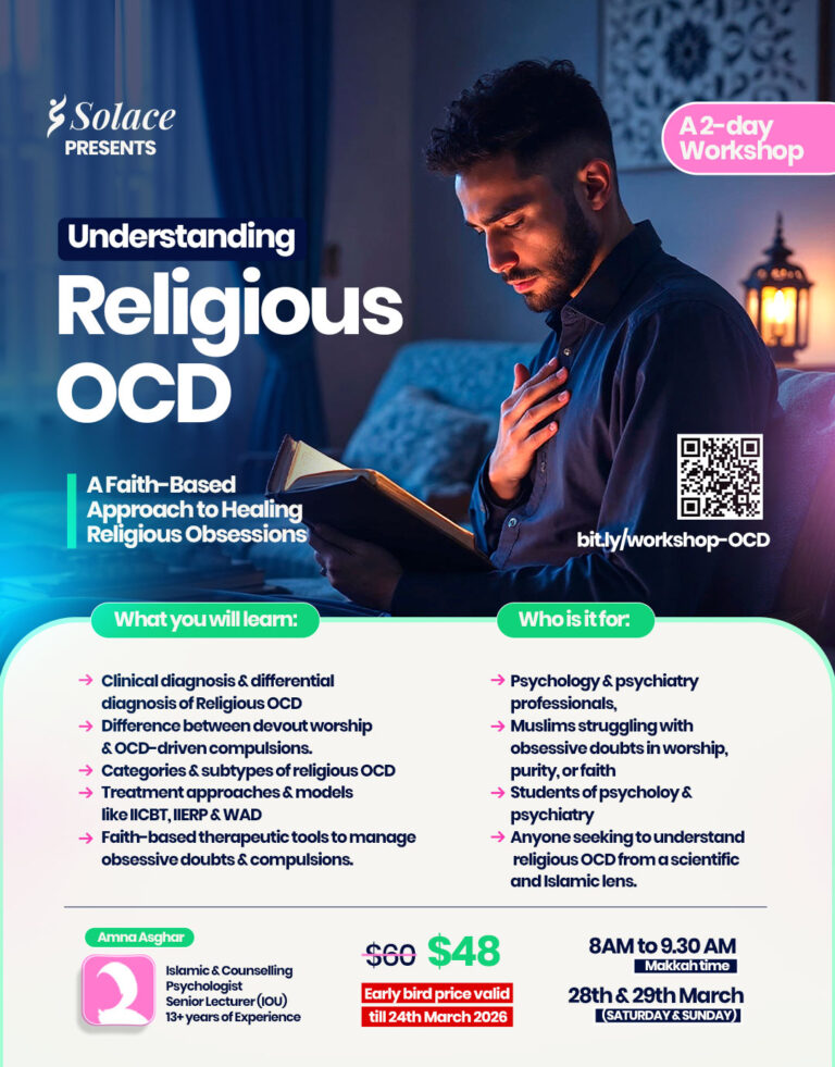 Solace presents “Understanding Scrupulosity OCD: A Faith-Based Approach to Healing Religious Obsessions,” a 2-day workshop with Amna Asghar integrating modern psychology with Islamic teachings, offering clarity, compassion, and practical tools to distinguish devout worship from OCD-driven compulsions.